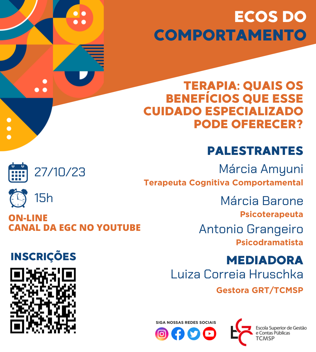 Para discutir a importância da terapia como forma de enfrentar esse quadro, o programa Ecos do Comportamento receberá o psicodramatista Antonio Grangeiro, a psicoterapeuta Márcia Barone e a terapeuta cognitiva comportamental Márcia Amyuni. O encontro acontece em 27 de outubro, às 15 horas, em formato online, com transmissão pelo canal da EGC no Youtube, e terá mediação de Luíza Correia Hruschka, responsável pela Gestão das Relações do Trabalho (GRT) do TCMSP.