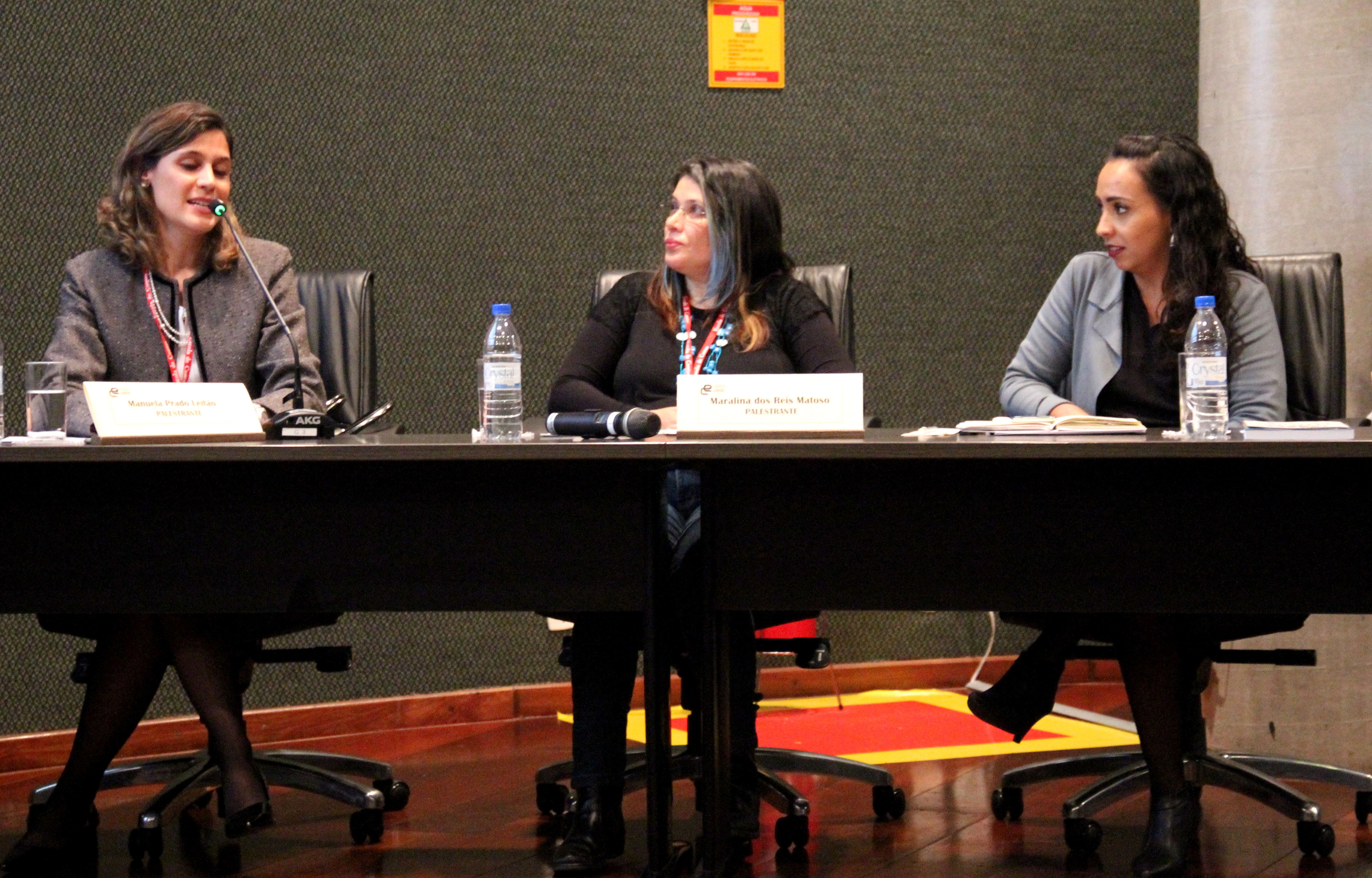 Mesa com as palestrantes Manuela, Maralina e a coordenadora Suelem